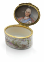 Oval, auf dem Deckel, dem Boden und den Seiten feine Watteau-Malerei in floral konturierten, pastellfarbenen Rocaillen. Im Deckel das Portrait eines Edelmannes im Harnish mit blauer Schärpe. Vergoldete Metallmontierung. Min. ber.