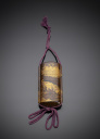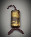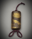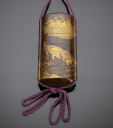 In takamaki-e and hiramaki-e farmers in a field pulling a barge, on the opposite bank farmhouses, on a black and brown ground imitating wood grain.